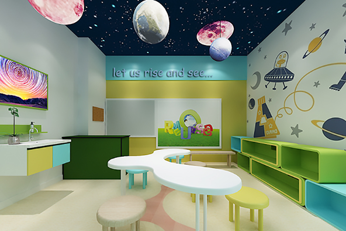 少兒英語(yǔ)培訓(xùn)學(xué)校一般會(huì)根據(jù)年齡的不同劃分為若干個(gè)班級(jí),設(shè)計(jì)師要根據(jù)空間面積合理劃分。設(shè)計(jì)師在設(shè)計(jì)的時(shí)候要盡可能的將學(xué)習(xí)區(qū)域與玩耍區(qū)域劃分開(kāi),保證孩子們有足夠的寬敞的活動(dòng)空間。對(duì)于角落空間可以制作儲(chǔ)物柜或者小擱架,不僅可以擴(kuò)大室內(nèi)空間,而且還可以形成美觀、流暢及統(tǒng)一的視覺(jué)效果。